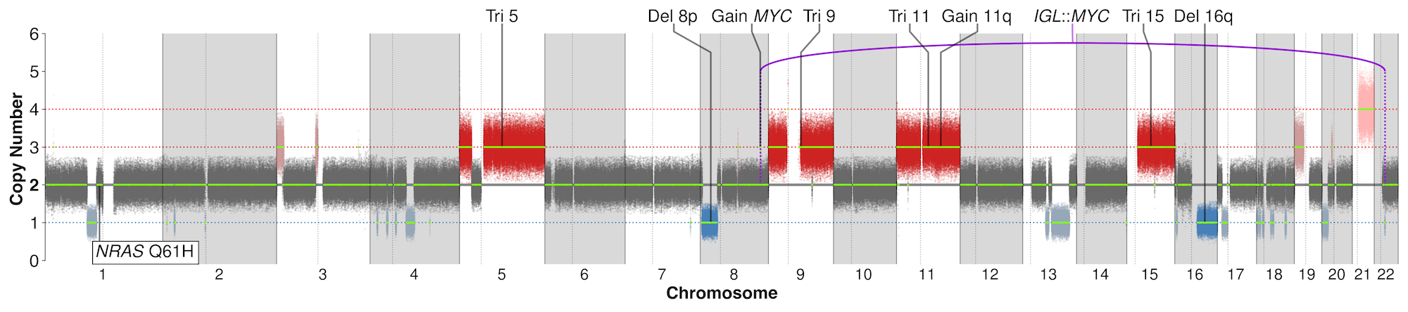 - Copy number variants (CNV) – Large chromosomal gains/losses such as Del1p (CDKN2C loss/deletion), 1q+ (CKS1B gain/amplification) and Del17p (TP53 loss/deletion), as well as small focal events, such as TP53 deletions.
