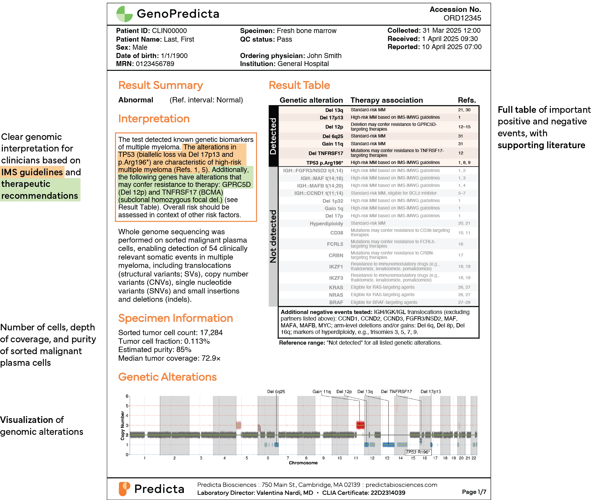What will the GenoPredicta™ report tell me?The report will show genetic changes that have been detected in your myeloma cells. It may also include information about how your cancer might respond to different treatments.